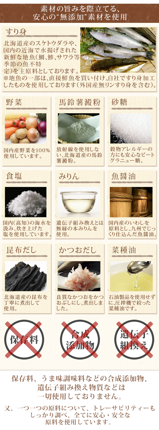 | 原材料名 | 魚肉(日本、ニュージーランド)、ゆで卵(国内製造)、大根(国産)、こんにゃく、鰹だし、昆布だし、砂糖(ビートグラニュー糖)、馬鈴薯澱粉、イカ、醤油(大豆、小麦を含む)、食塩、ごぼう、味醂、食用菜種油、魚醤(イワシ、食塩)/水酸化カルシウム |