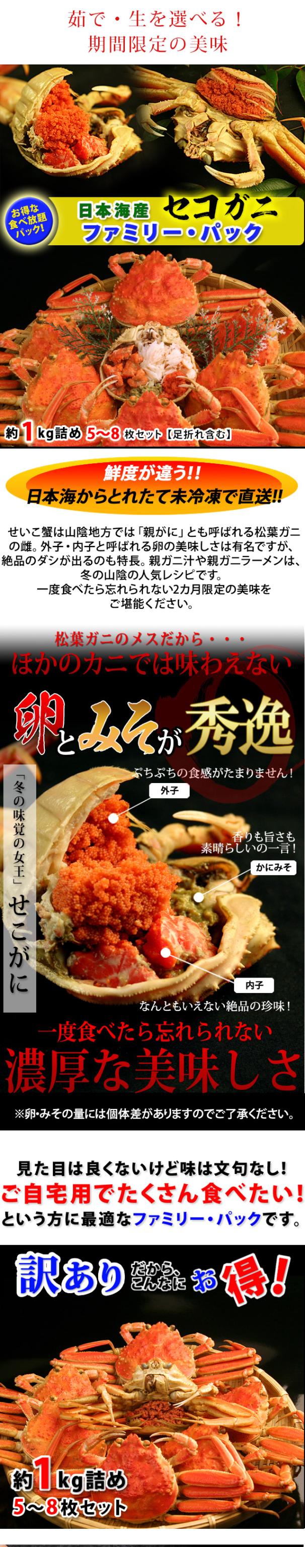 せいこ蟹は別名「親がに」「こうばこがに」とも呼ばれる松葉ガニの雌。外子・内子と呼ばれる卵の美味しさは有名ですが、絶品のダシが出るのも特長です。資源保護のため、漁獲時期は11月6日から12月31日までの約2カ月間のみ。当商品は足折れ(2〜3本程度)やヤケ(黒い汚れ)、キズがあるものも含むお得な1キロファミリーパックとなります。※発送状態(ボイルか生)をお選びいただけます。