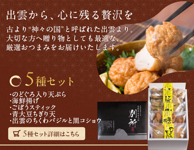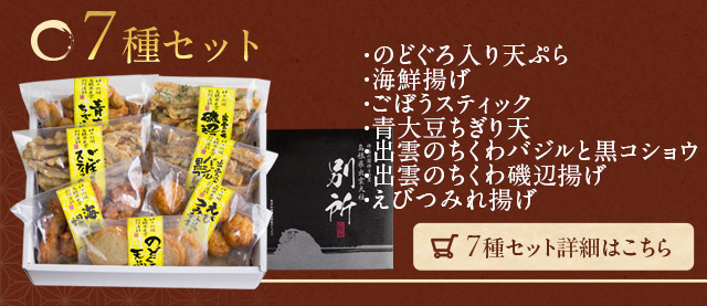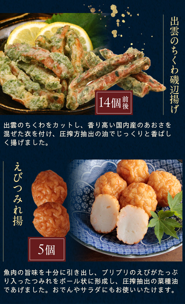 | 内容量 | 【のどぐろ入り天ぷら】100g(5枚入) 【海鮮揚げ】 100g(3個入) 【ごぼうスティック】100g(14個前後) 【青大豆ちぎり天】100g(12個前後) 【出雲のちくわバジルと黒コショウ】100g(8個前後) 【出雲のちくわ磯辺揚げ】100g(8個前後) 【えびつみれ揚げ】100g(5個入) |