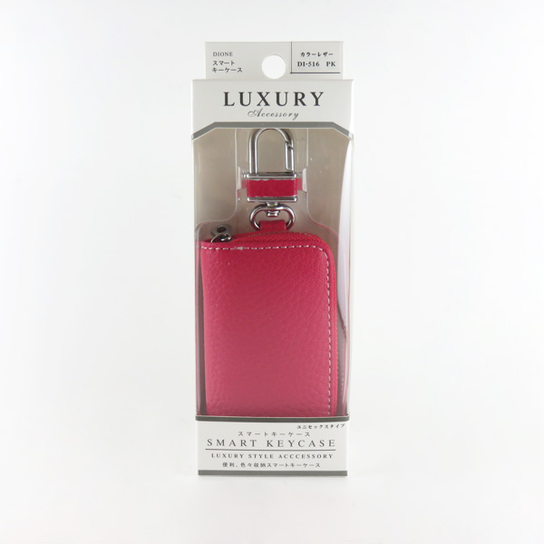プラウド スマートキーケース レザー調 ピンク 鍵入れ カラビナ チェーン付 小物入れ 便利 収納 ワンタッチ DI-516