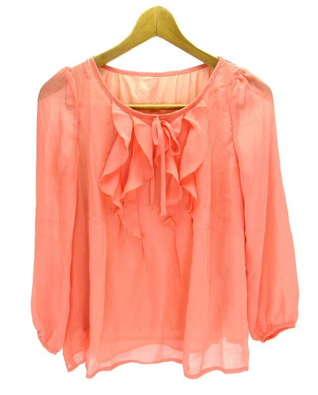 送料無料 訳あり 在庫処分 ブラウス シフォン フリル リボン レディース 裏地あり 七分袖 夏 涼しい サーモンピンク かわいい 小さめ Sサイズ Mサイズ i1tops003