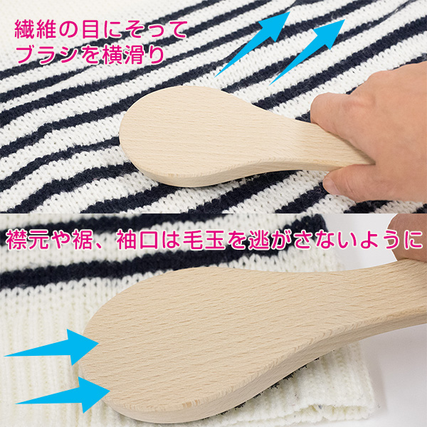 そこで、袖口に沿ってブラシを縦方向に動かすとよく取れますが、生地の厚いセーターなどの凹凸の大きいものや立体的なものはブラシの当たりが安定しないので、力が入れづらいですね。ブラシの先端部分だけ毛束を増やし、襟元やそで口の毛玉も楽に取れるように工夫しました。
