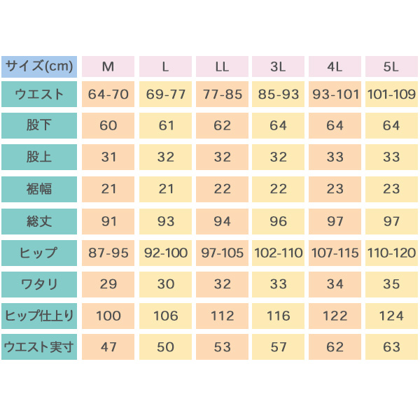 | サイズ(cm) | ウエスト | 股下 | 股上 | 裾幅 | 総竹 | ヒップ | ワタリ | ヒップ仕上がり | ウエスト実寸 |