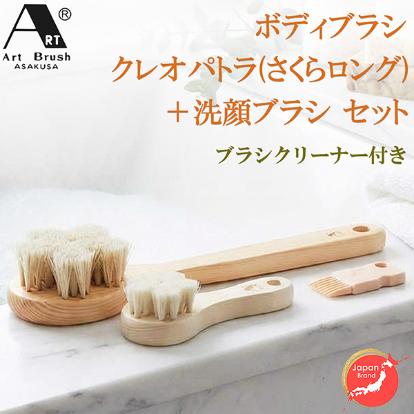 浅草アートブラシ 正規品 白馬毛ボディブラシ さくらロング(クレオパトラ)+ヤギ毛 洗顔ブラシ『さくら』(ブラシクリーナー+ブラシスタンド付)