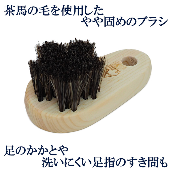 茶馬の毛を使用したやや硬めのフットブラシは、足のかかとや洗いにくい足指のすき間、爪の内側にも届き、キレイに洗えます。