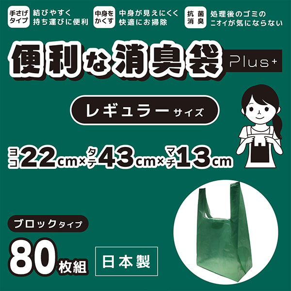 送料無料 便利な消臭袋 PLUS+ 柿渋 抗菌 消臭 高機能フィルム 消臭袋 ゴミ袋 プラス レギュラー 約10L 80枚組-オムツ処理袋 汚物入れ 日本製 取っ手付き 生ごみ袋 キッチン オムツ ペット 脱臭 SPP-10259