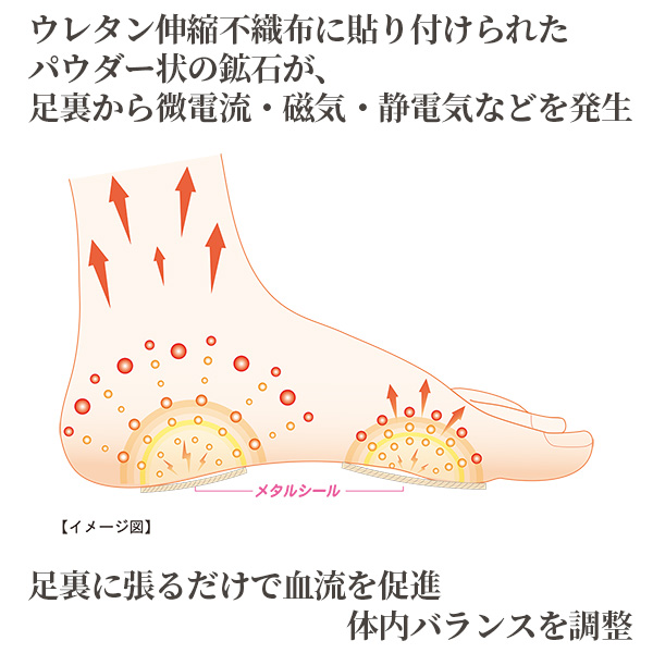 ウレタン伸縮不織布に貼り付けられたパウダー状の鉱石が、足裏から微電流・磁気・静電気などを発生させ、血流促進・肩こりの改善・体内バランスの活性など全身に有益に働きかけます。