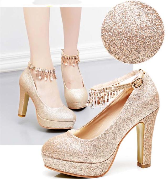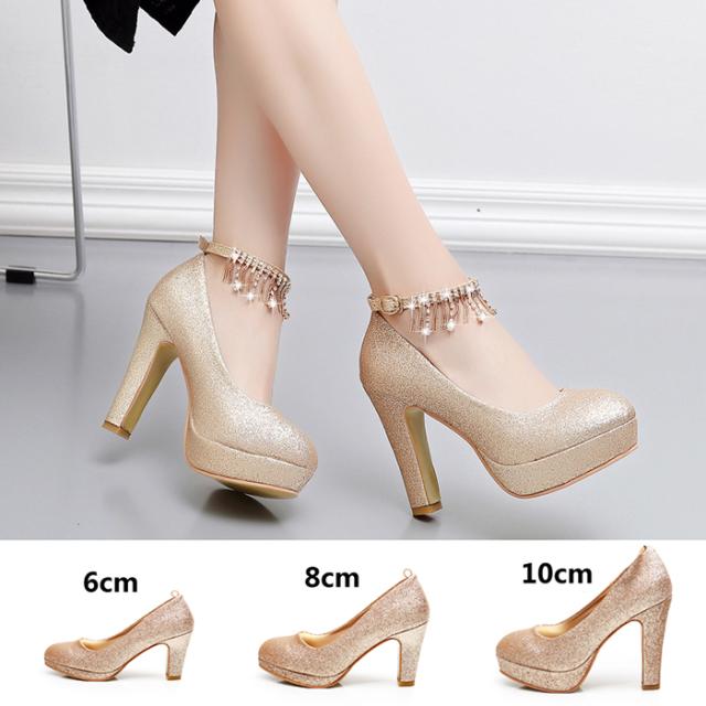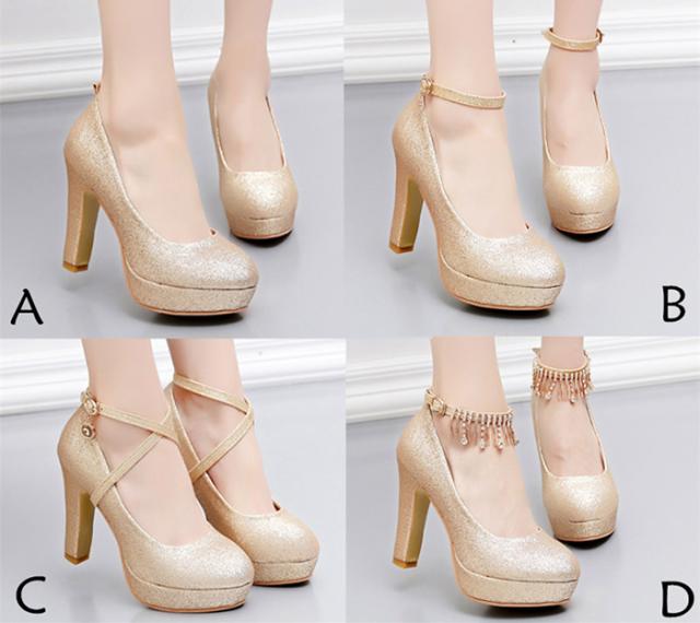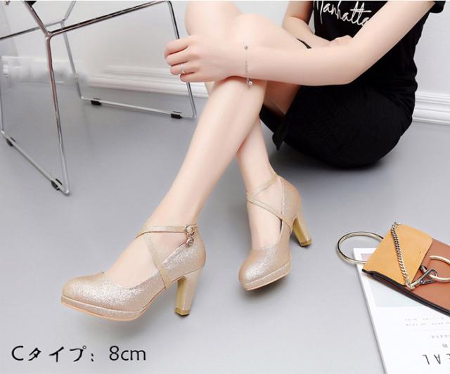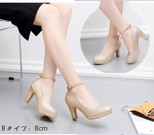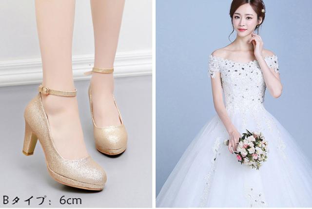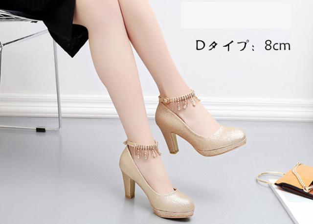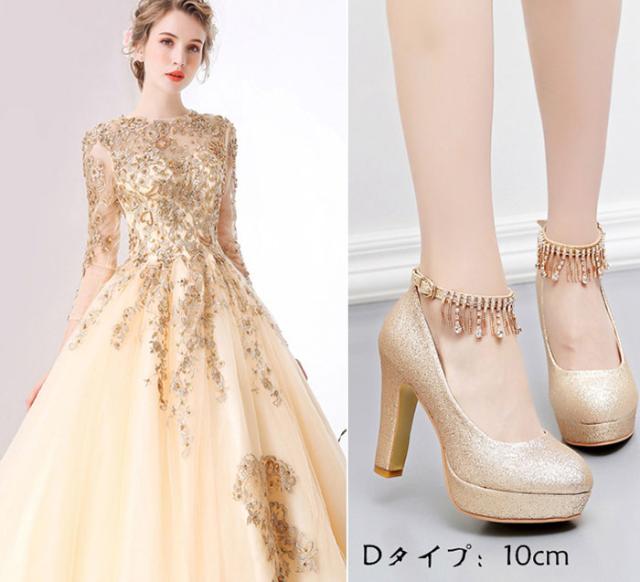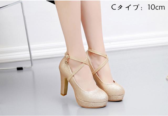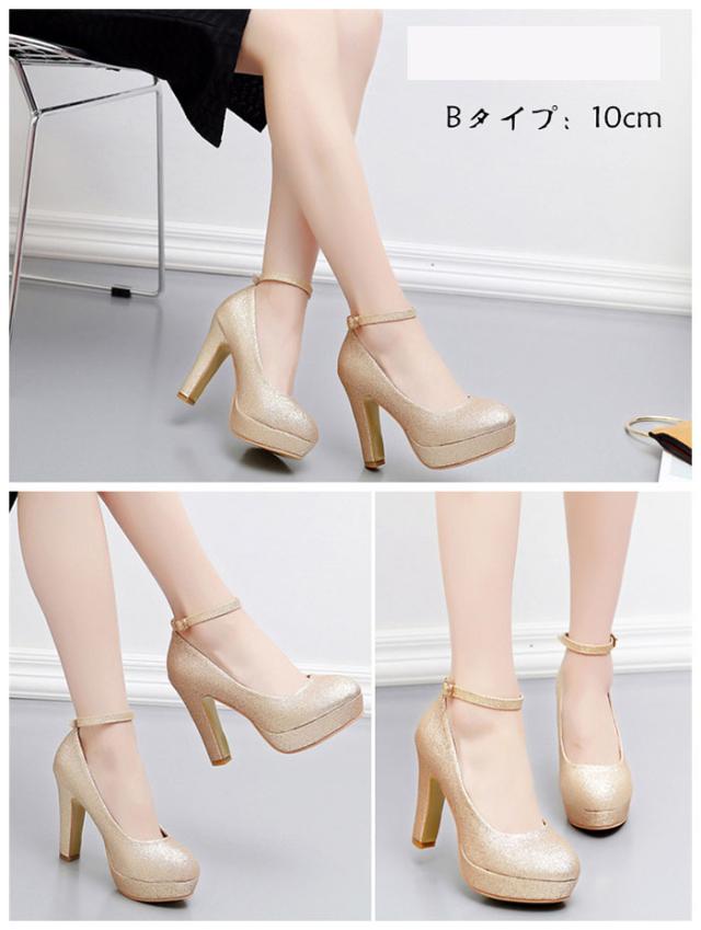 パンプス 結婚式 太ヒール ラウンドトゥ ウェディング シューズ セクシー 靴 ハイヒール 選べるストラップ ヒールの高さ選べる ゴールド