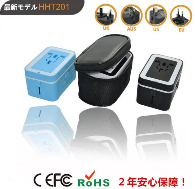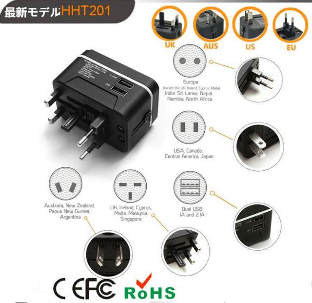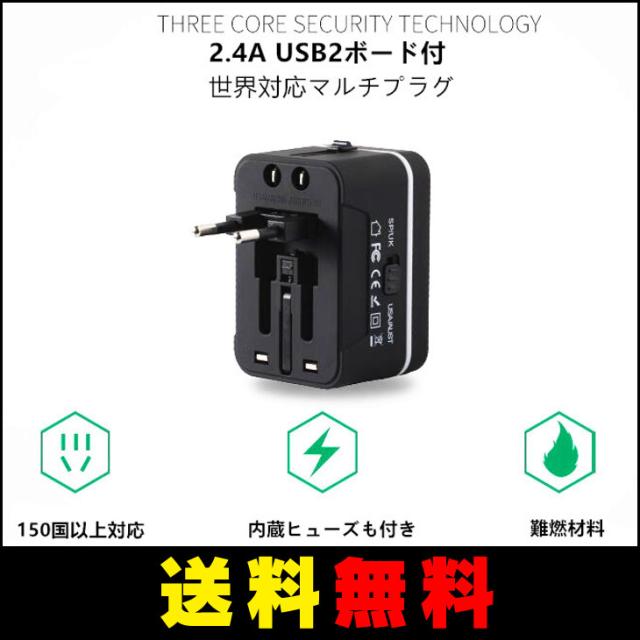 【送料無料】 世界対応マルチプラグ トラベルコンセントプラグ マルチ変換ACアダプター2ポートUSB(2.4V)付き ヒューズ付き二年保証