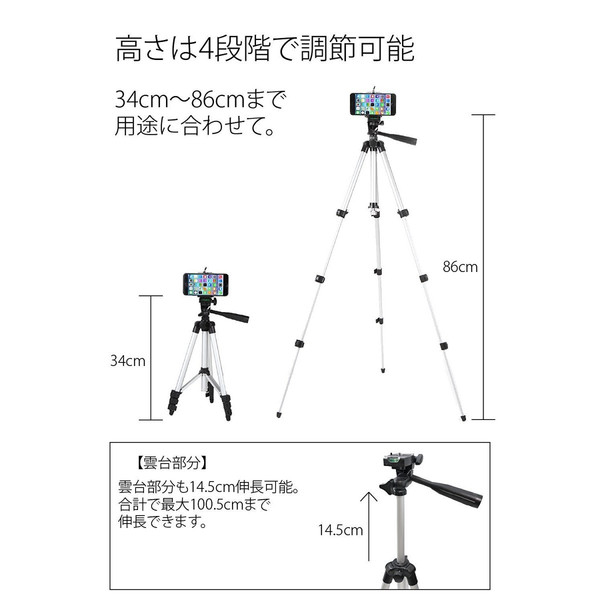 雲台部分でも14.5cmの調節ができ、最長で高さ100.5cm(86cm+雲台部分14.5cm)まで調節できます。