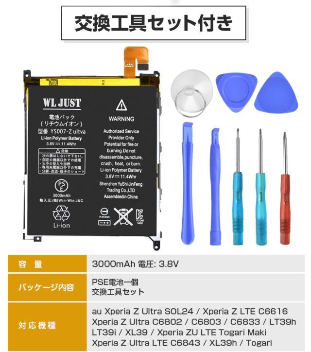 PSE認証 Xperia Z Ultra LIS1520ERPC 互換バッテリー ( SOL24 ) 交換工具セット付き