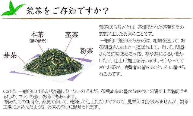 「荒茶」とは 茶園で摘み取られた生葉は、たくさんの製茶工程を経て「お茶(緑茶)」になります。 茶農家が生葉を摘み取り、荒茶と呼ばれるお茶まで加工します。これが「荒茶」です。 本茶、茎茶、芽茶、粉茶のすべてが入っており、独特な風味と水色、まろやかな味がお楽しみいただけます。