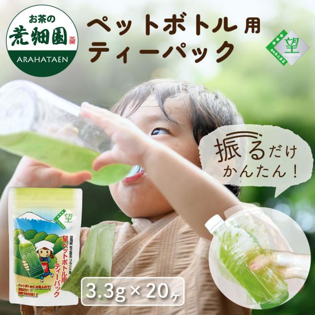 ティーパック1個で500mlペットボトル1本分が、驚きの25円!飲みたいときにすぐ冷茶が作れる!牧之原ブランド茶「望 銀印」ペットボトル用 静岡県牧之原市ブランド茶「望 銀印」がペットボトル用ティーパックになって新登場。濃い味なのにまろやかでゴクゴク飲めちゃう♪ あと味も爽快な美味しさ! 市販のペットボトル飲料よりも断然、経済的で!美味しくて!健康的です!!【作り方はとっても簡単!】ペットボトルにティーパック1個と水を入れて、シャカシャカ振るだけでOK♪ペットボトルの形状に合わせたスリムなティーパックだから、出し入れが簡単です!【牧之原ブランド茶「望」の特徴は】「望」は、新芽を摘み取る前の数日間、茶園にネットをかぶせて強い日光を遮って育てたお茶です。茶処・静岡でもまだそう多くはない栽培方法です。遮光することで、旨味成分の「テアニン」が増え、渋味が少なくまろやかで旨味の強いお茶になります。また、茶葉が濃い緑色になるため、この葉で淹れたお茶の色は、とても美しい緑色です。