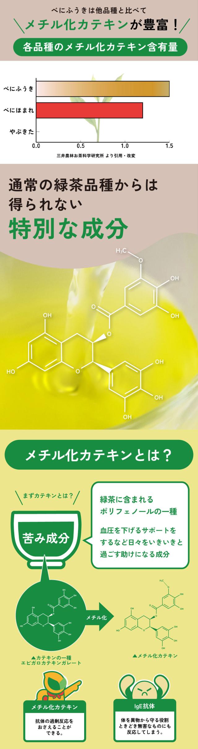 「べにふうき」には「メチル化カテキン」が豊富に含まれています。 カテキンの苦味渋味を無くす研究を続け、誰でもおいしく飲みやすく開発されたのが、荒畑園の「べにふうき」です。 毎年このメチル化カテキンが注目され、口コミで広がり多くの方にご愛飲いただいております。 べにふうきに含まれる重要成分「メチル化カテキン」はお茶の苦味渋味をなんとか飲みやすく作ることはできないか・・・。 そして試行錯誤の結果ついに「メチル化カテキン」がきちんと残り、紅茶風味もあるという最良の製造方法を開発することに成功しました。べにふうき100%の混じりけ無し!荒畑園が自信を持ってお届けする「べにふうき」を、ぜひお試し下さい。