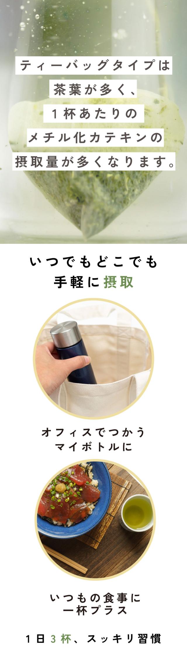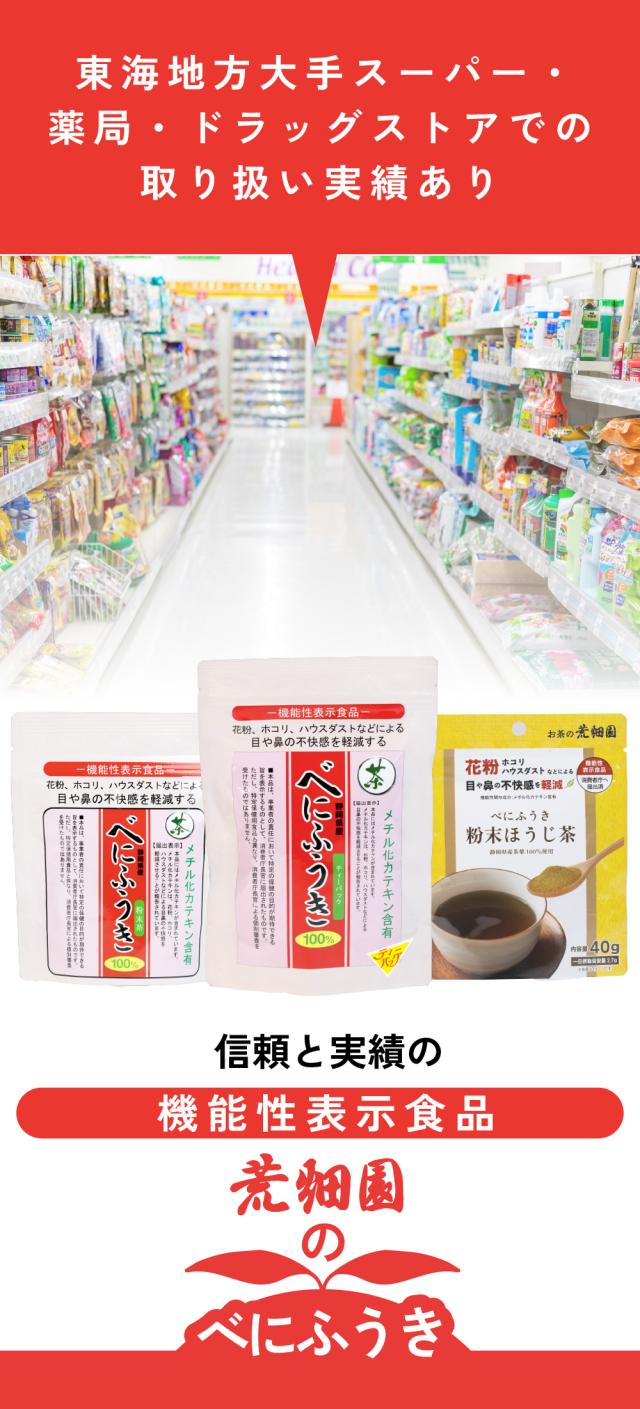 べにふうきに含まれる《メチル化カテキン》がハウスダストやほこりなどによる目や鼻の不快感を軽減する。荒畑園の独自製法による紅茶風味のべにふうきです。ティーパックタイプは茶葉の量が多いから1杯あたりのメチル化カテキンの摂取量が多いのが特長です。