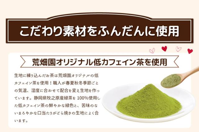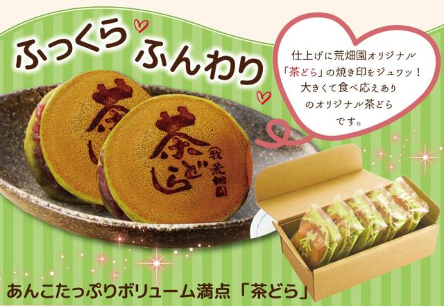 「荒畑園の茶どら」は当園のさんさん茶をねりこんだ鮮やかな緑茶色の生地。