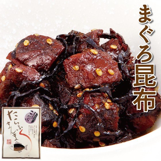 原材料名:鮪、昆布、醤油(大豆、小麦を含む)、飴、砂糖、醸造調味料、緑茶、ごま、甘味料(天草)、寒天、保存料(ソルビン酸)、調味料(アミノ酸等)、海洋深層水、着色料(赤106、黄5)