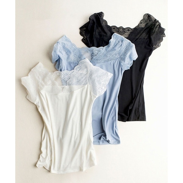 ドレススターのVネックレースフレンチスリーブ【 フレンチスリーブインナー 】レースがフェミニンなフレンチスリーブインナー。見せるレイヤードアイテムとしても使える、機能的デザインが魅力。肩が隠れるストレッチレースのフレンチスリーブディティールで、上品な女性らしさのある印象に仕上げました。気になる二の腕を優しくカバーしてくれます。身生地にはシルクのような滑らかな質感でストレッチ性のある素材を使用しています。ニットやカーデ、カットソーなどのインナーとして幅広く活躍することに間違いなし♪インナーとしても部屋着用としても使える万能アイテムです。柔らかな肌触り。きめ細やかで上質な素材感です。ホワイト、 ブラック、 ブルー洗濯:手洗い可ストレッチ有りです。パッド無しです。[型番:TF002]