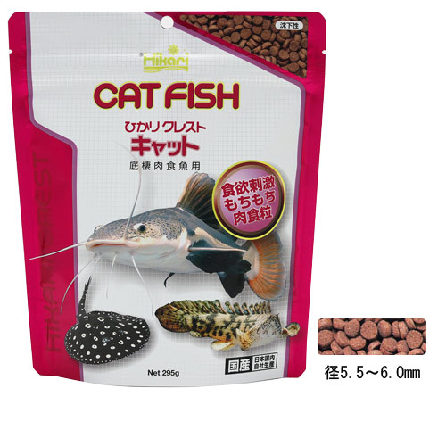 “ひかりクレストキャット”は、迫力のある魚体が魅力の底層で生活する大型なまず類を、骨格からしっかり成長させる沈下性の専用飼料です。