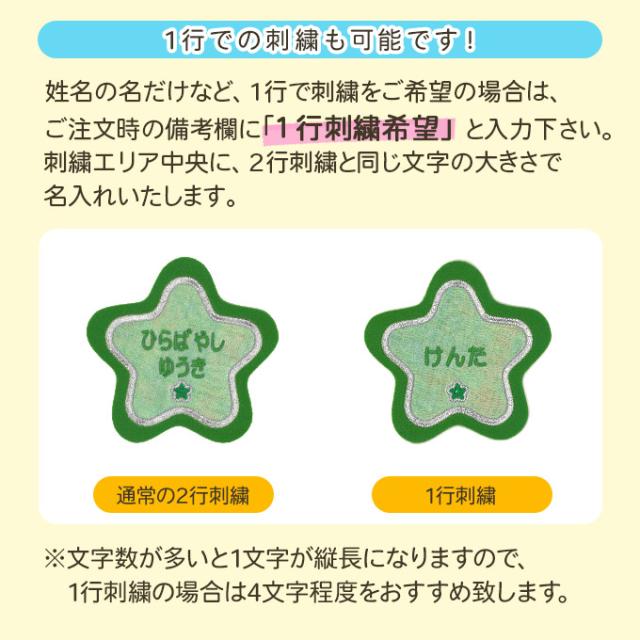 【1】「ひらがな」「カタカナ」「ローマ字」「数字」「漢字」からお選びいただけます。 ※画数の多い漢字は文字がつぶれる可能性がございます。 ※8文字以上になると縦長の文字になり読みづらくなります。 (2行タイプの場合は1行当たり5文字までとなっております) 【2】刺繍するお名前は【お名前入力欄】にてご指定ください。 |