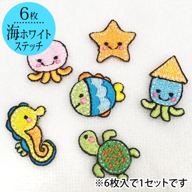 ワッペン ホワイトステッチ 海 魚 小 6枚セット アイロン 刺繍 マーク シンプル プレゼント 服 ワンポイント かわいい
