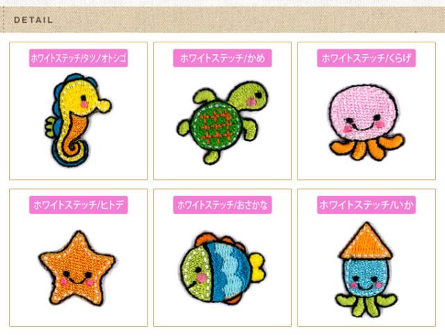 ホワイトステッチがポイント♪ 海の生き物をかわいくデフォルメしたワッペンです。 入園入学の準備にもおすすめです。 |