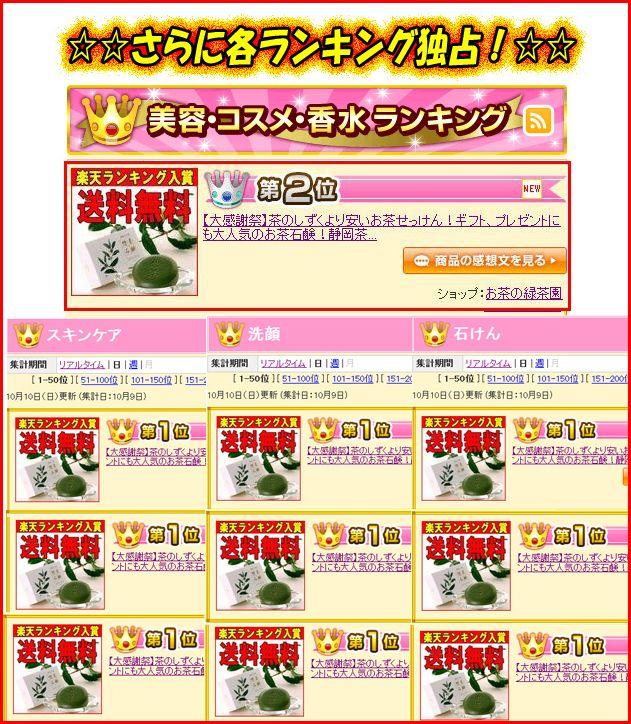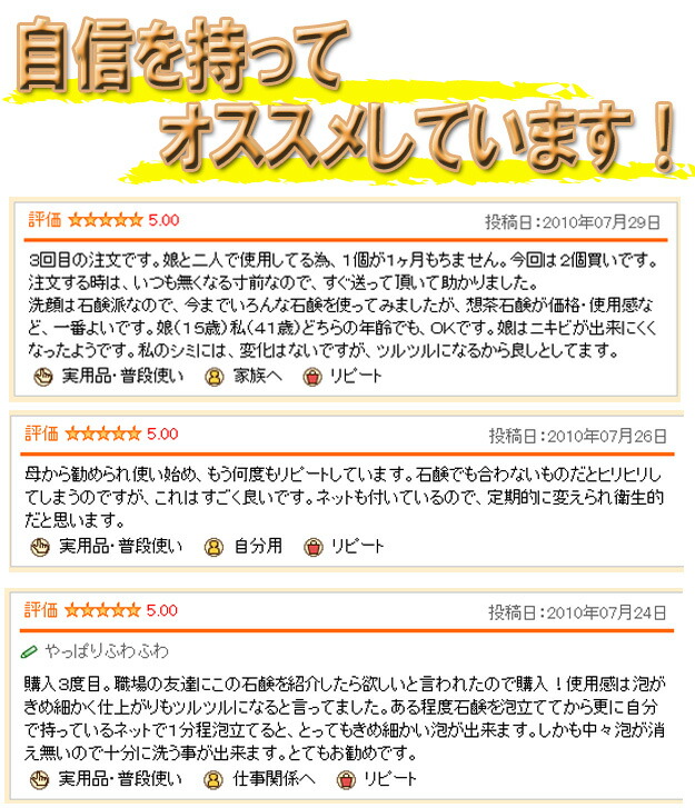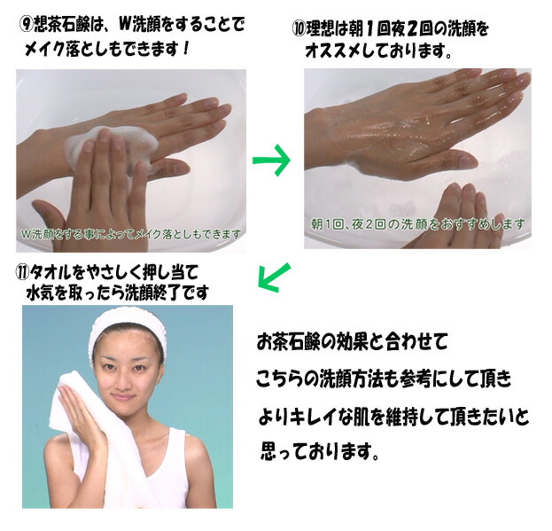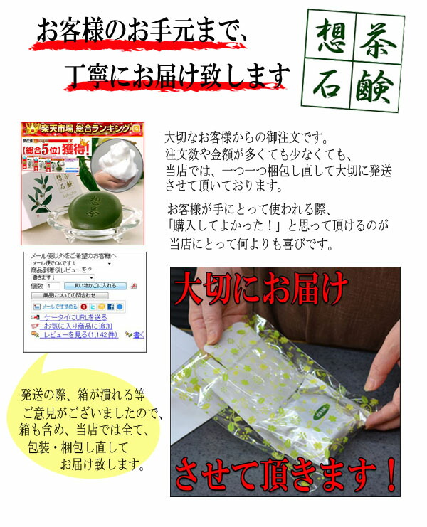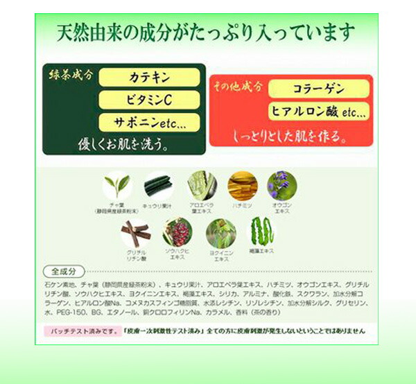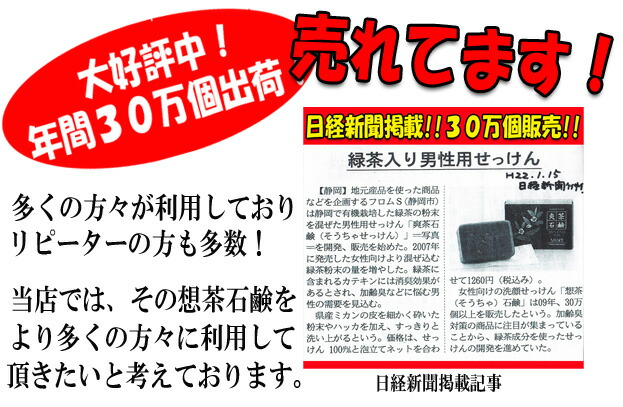 <静岡産有機無農薬茶葉使用!(無農薬)>緑茶の美肌成分と、必須ミネラルを豊富に含んだ"麦飯石鹸超微粒子"が「想茶石鹸の特徴」です。お茶に含まれるカテキン・ビタミンC・サポニンなどの成分が優しく肌を洗い、コラーゲン・ヒアルロン酸などの肌を守る潤い成分がしっとりとした肌を作ります。そのため、洗った後がつっぱりません。無防腐剤・天然植物油100%でお肌に優しくきめ細やかな泡立ちと涼やかな香りが人気です。○カテキンカテキン成分がお肌を引き締め、紫外線のダメージからお肌をブロック!○ビタミンC豊富なビタミンCがメラニンを抑制し、コラーゲンの育成を助けます。○サポニンお茶をたてる時に出る泡の力でお肌の油を溶かし、毛穴につまった皮脂やメイクの汚れをとりのぞきます。他にも、コラーゲン ・ヒアルロン酸 ・オウゴンエキス ・アロエベラ葉エキス ・ヨクイニンエキス ・ソウハクヒエキス等、お肌を美しく守る成分がたくさん入っています。※10月の大感謝祭では15秒に1個販売させて頂きました! |