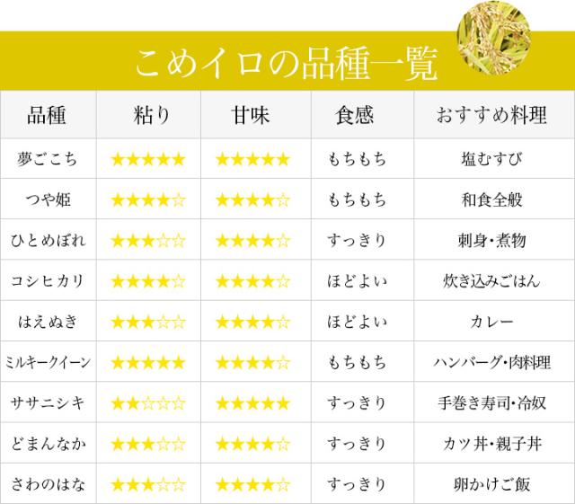 家族みんなが揃う食卓で、山形の色々なお米を、美味しく笑顔で食べて頂きたい。そんな想いから【こめイロ】は生まれました。こめイロでは、山形県内・全4地域のこだわりのお米6品種をお試し頂けます。もちもちっとして粘りが強く、冷めても硬くならないお米。すっきりとして粘りが少なく、暑い時期こそ食べたくなるお米。毎日、違う品種を食べ比べてみると、自分好みのお米が発見できます。食べ比べてみるも良し、料理に合わせてお米を変えるも良し、家族みんなの好みのお米を見つける楽しみ…ぜひご堪能下さい。