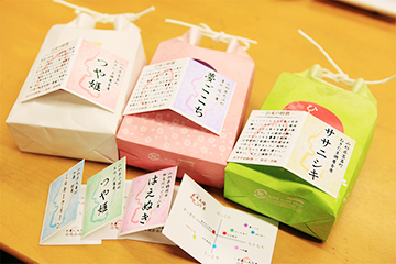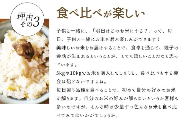 冷めても固くならないもちもちなお米や、刺身等に合うすっきりした食感のお米など、特徴の異なる6品種の特別栽培米を揃えました。1袋3合(450g)入りなので、計量する必要はなく、そのまますぐに炊飯釜に空けて頂けます。色々なお米を食べ比べて頂く事で、お客様のお好みのお米が見つかれば幸いです。