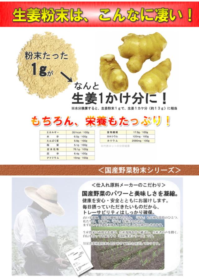 この生姜を100メッシュという細かなパウダーにした生姜粉末は、たった1gの粉末でも、生換算量がなんと約13g!!(だいたい生の生姜1カケ分)もあります!