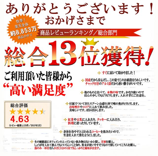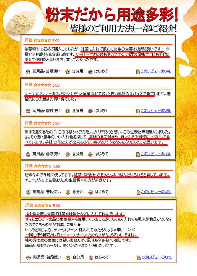 - 60歳の声を聞いた途端、風邪をひきやすくなりました。冷え症もあり、免疫力も高めたいと思っていた所に粉末があるのを見つけました。いつでも簡単に使えるし、保存も楽。紅茶やお料理に手軽に使っています。 生に...