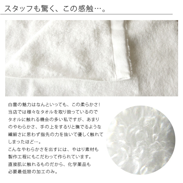 その究極の肌触りを追求し、綿花がもつ優しいやわらかさが楽しめるように、白雲は素材にこだわり作られています。