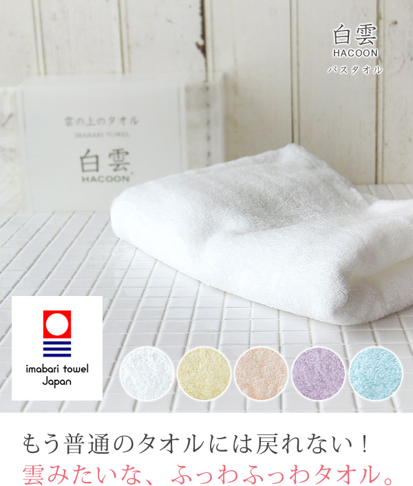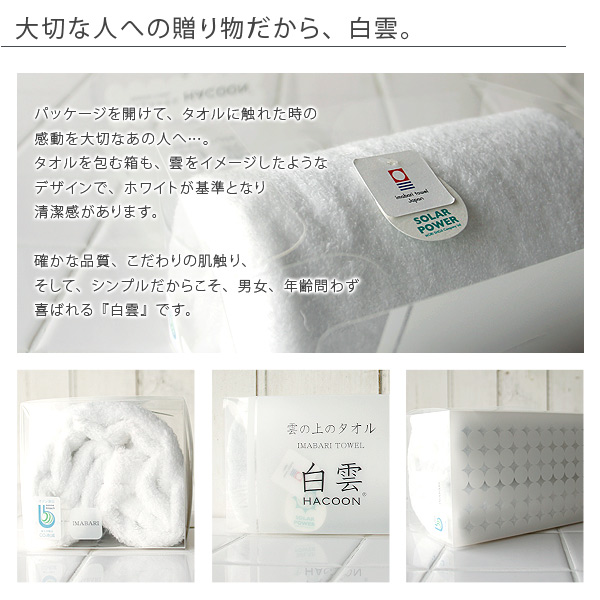 商品説明 タオルの産地今治で生まれた、白雲(HACOON)という名の真っ白なタオルです。白雲は究極の肌触りを追求し綿花が持つ優しい柔らかさがお楽しみいただけるよう、素材にこだわり、必要最小限の科学薬品で加工されております。また天然物質であるオゾンで漂白することにより加工工程にてCO2の削減を心がけております。だから地球にも優しいタオルなんです♪白雲という名前のとおりまっしろでまるで雲のようなふかふかな風合いの清潔感あふれるタオルはギフトにもオススメです。