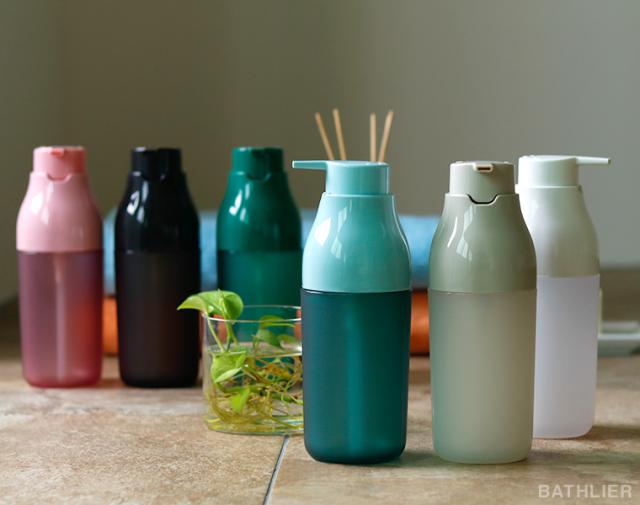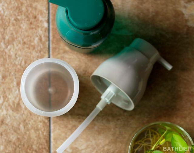 押しやすいポンプ、詰替えやすい広い注ぎ口、中身が少なくなっても倒れにくい工夫。気持ちのいいバスタイム