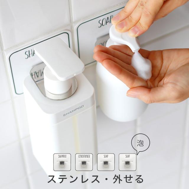 ボトルホルダーは、シャンプー、コンディショナー、ソープの3種類。ソープ2種類、ボディソープをいれてもよし、キッチンや洗面所ではハンドソープにぴったり。