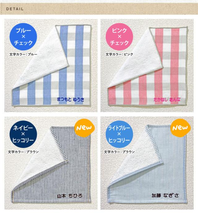 | 商品について | 片面ガーゼ仕様のタオルが新登場♪ 表面はコットンガーゼ、裏面はふわふわのパイル地仕様で、やさしい手触りと使い心地のタオルです。 1枚ずつ丁寧にお名前を刺繍してお届けしますので、面倒なお名前つけの必要がありません。刺繍なのでお洗濯をしてもお名前が消えることなく、長くお使いいただけます。 |