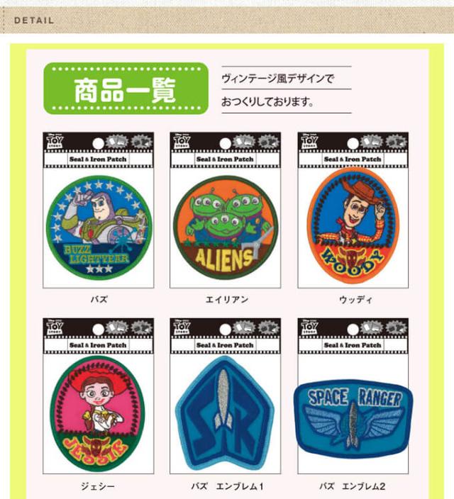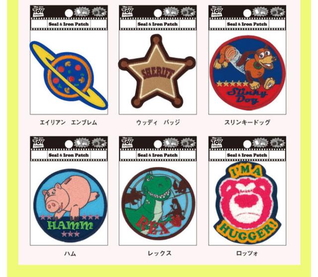 【バズ2】約W 75mm×H 75mm 【エイリアン】約W 75mm×H 75mm 【ウッディ2】約W 65mm×H 85mm 【ジェシー】約W 65mm×H 85mm 【バズ エンブレム1】約W 70mm×H 83mm 【バズ エンブレム2】約W 85mm×H 55mm 【エイリアン エンブレム】約W 105mm×H 50mm 【ウッディ バッジ】約W 80mm×H 78mm 【スリンキードッグ】約W 75mm×H 75mm 【ハム】約W 75mm×H 75mm 【レックス】約W 75mm×H 75mm 【ロッツォ】約W 69mm×H 84mm |
