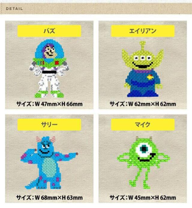 【バズ】約W 47mm×H 66mm 【エイリアン】約W 62mm×H 62mm 【サリー】約W 68mm×H 63mm 【マイク】約W 45mm×H 62mm |