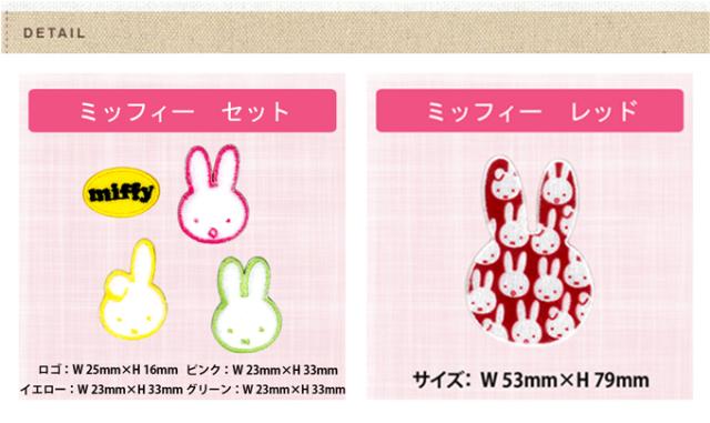 【ミッフィー レッド】約W 53mm×H 79mm 【ミッフィー セット】 ロゴ 約W 25mm×H 16mm ピンク 約W 23mm×H 33mm イエロー 約W 23mm×H 33mm グリーン 約W 23mm×H 33mm |
