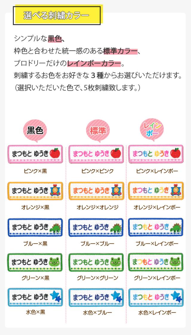 | セット内容 | 5枚セット ふちがブルーのワッペンの標準カラーはブルー文字です。 ふちがピンクのワッペンの標準カラーはピンク文字です。 ふちがオレンジのワッペンの標準カラーはオレンジ文字です。 ふちがグリーンのワッペンの標準カラーはグリーン文字です。 |