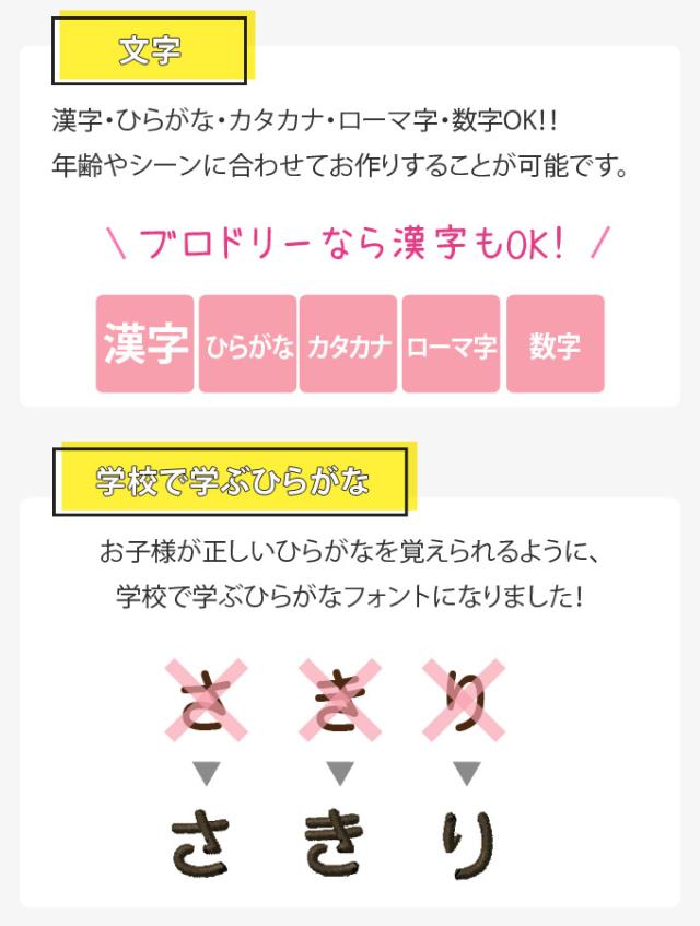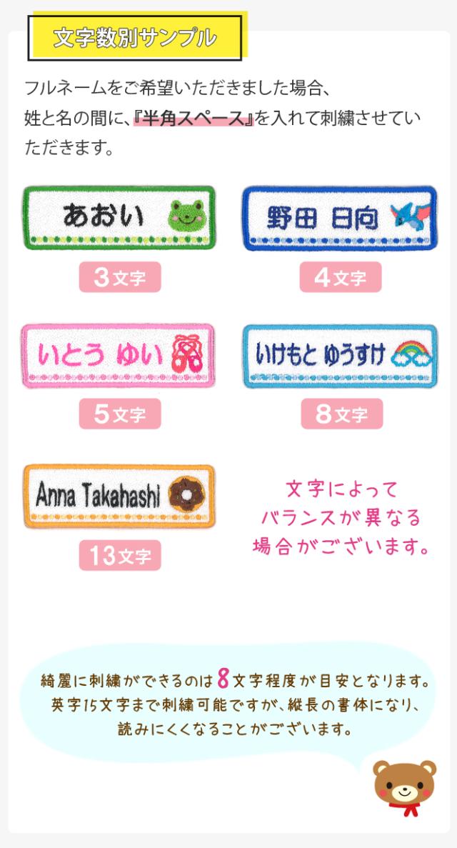 【1】「ひらがな」「カタカナ」「ローマ字」「数字」「漢字」からお選びいただけます。 ※画数の多い漢字は文字がつぶれる可能性がございます。 ※8文字以上になると縦長の文字になり読みづらくなります。 (2行タイプの場合は1行当たり5文字までとなっております) 【2】刺繍するお名前は必ず【お名前入力欄】に記入してください。 |