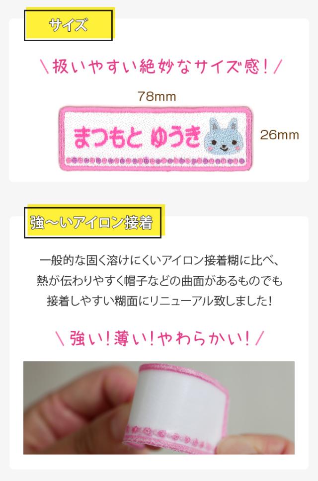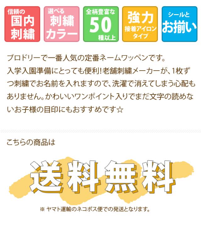 | 商品について | ブロドリーで一番人気の定番ネームワッペンです。 1枚ずつ刺繍でお名前を入れますので、洗濯で消えてしまう心配もありません。かわいいワンポイント入りでまだ文字の読めないお子様の目印にもおすすめです☆ |