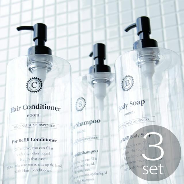 水周りでの使用に強いプラスチック製のソープディスペンサー(詰め替え用ボトル)の3本セット。