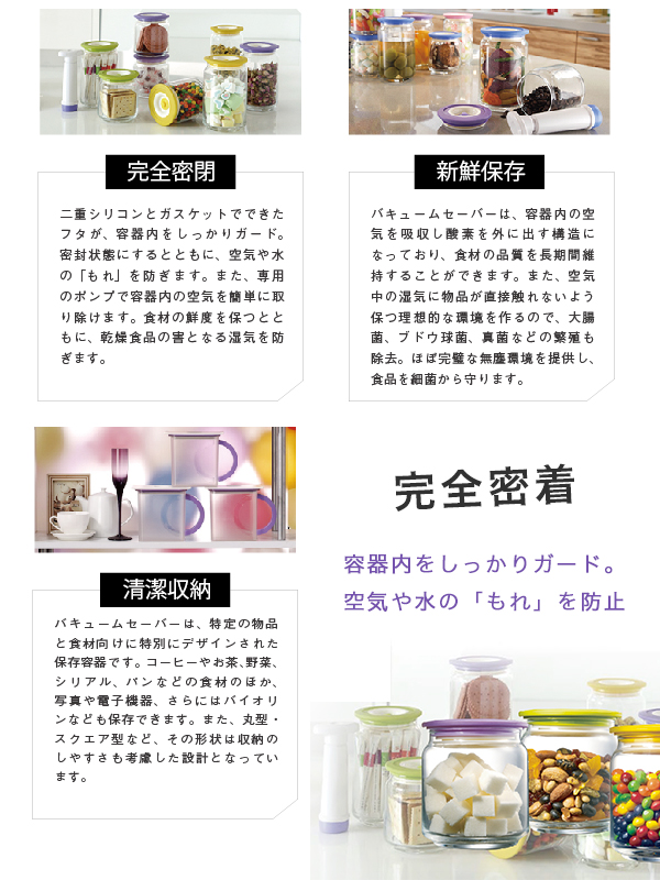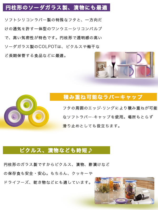 クリアなソーダガラスで食品の保存に最適な「COLOPOT(コロポット)」。 二重シリコンとガスケットでできたフタが、容器内をきっちりガードして密封状態にするとともに、空気や水の「もれ」を防ぎます。 付属の専用ポンプで容器内の空気を簡単に取り除くことで、低真空状態に。そのため、食材の品質を長期間維持することができ、乾燥食材も湿気から守れます。 円柱形のガラス製なので、漬物やピクルスなどの保存食も安全・安心に長期保存可能。 クッキーやドライフルーズなどをいれて保存してもお洒落♪ シリコン製のフタなので積み重ねが可能。 カラフルなデザインがキッチンやテーブル周りを華やかに演出いたします。 【サイズ・容量】 パッケージサイズ:約 W308xH110xD92mm パッケージ込重量:約 970g 容量:500mL(1個あたり) ■生産地:台湾 ■素材・成分:フタ:ポリプロピレン+熱可塑性ラバー ボディー:ソーダガラス(フロスト) エアバルブ+ガスケット:シリコン ■パッケージ:化粧箱入り 【注意事項】 カラー:カナリアイエロー・アップルグリーン・ライラックパープル(3色セット) 付属品:ミニポンプx1 使用上の注意 ・粉状の食材はふたの機能を損なわないよう、袋に入れてから使用してください。 ・投げたり、落としたりしないでください。破損する可能性があります。 ・耐熱ガラスではありません。オーブンや電子レンジ等、発熱器具でのご使用はおやめください。 ・ガラス製ですので、お子さまの手の届かない場所に保管してください。 |