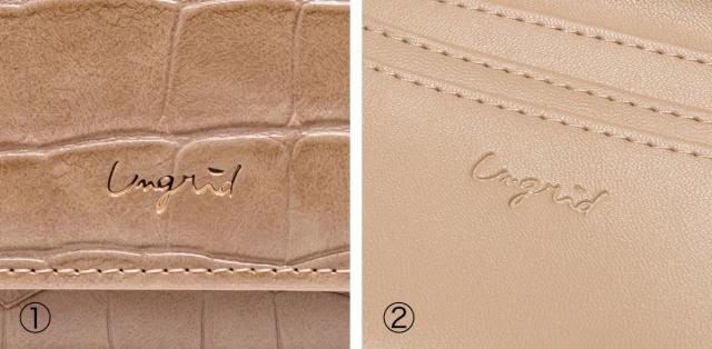① 表面には金具に合わせたゴールドロゴでデザインのアクセントに。