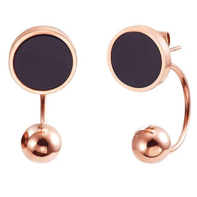 黒い丸型の大きめのスタッドピアスにボールタイプのバックキャッチをセットしたピンクゴールドカラーのステンレスピアス。シンプルなスタイルが大人の女性に人気のステンレスピアス。別売りのキャッチと合わせてスタッドピアスだけでもつかえるし、バックキャッチを違うピアスに合わせて使ってもおしゃれ。