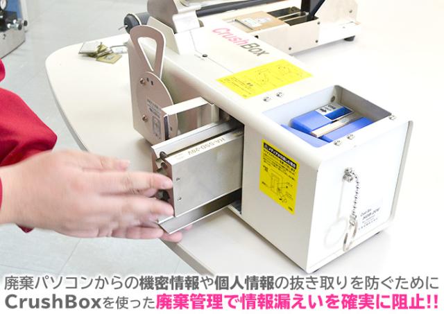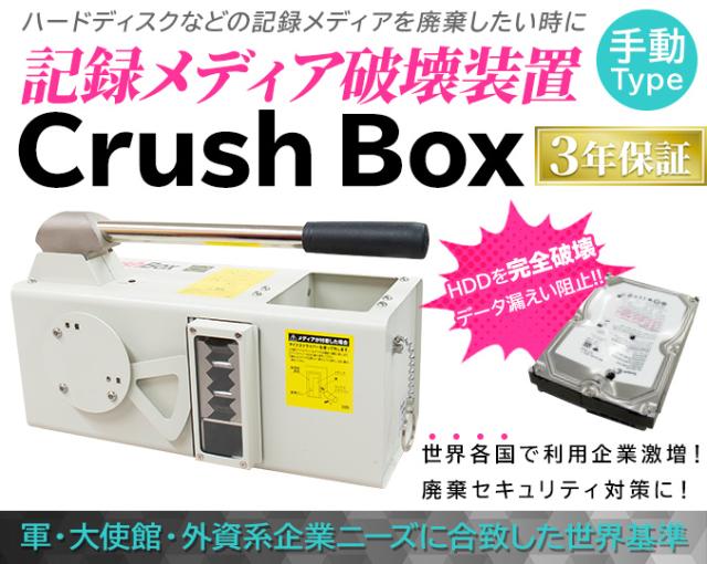 アメリカ・ヨーロッパなど世界20カ国以上の国や、官公庁、ISMS/プライバシーマーク運用企業で導入されている「Crush Box」は、超高圧油圧ユニットでHDD等の電子記録メディアを手動で簡単破壊!物理的破壊でデータ流出を防ぎます。