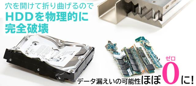 プラッタ(磁気ディスク)に穴をあけて破壊します。3.5インチハードディスクドライブだと処理時間がわずか数十秒なので、作業を円滑に進めることができます。