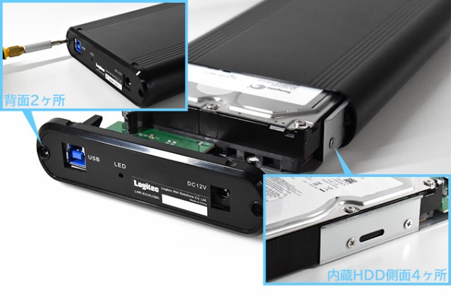 背面の2本のネジをはずして本体カバーをスライドさせ、ハードディスクを4カ所ネジ止めするだけのシンプルな固定方法です。4本のネジがハードディスクをしっかりホールドする安定設計なので、グラつきや移動時の振動を軽減します。
