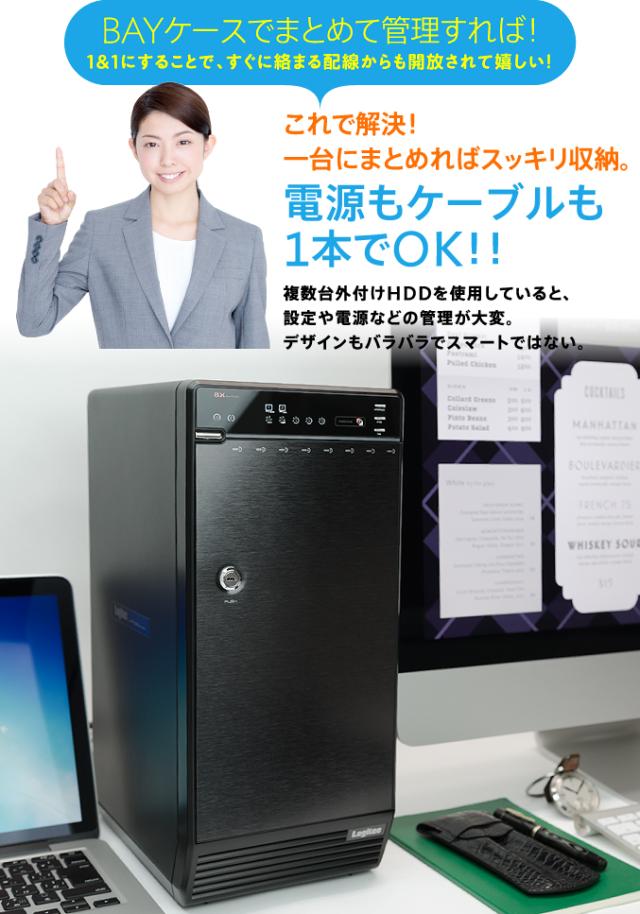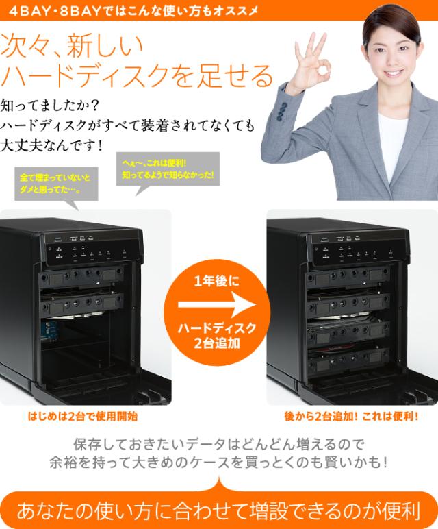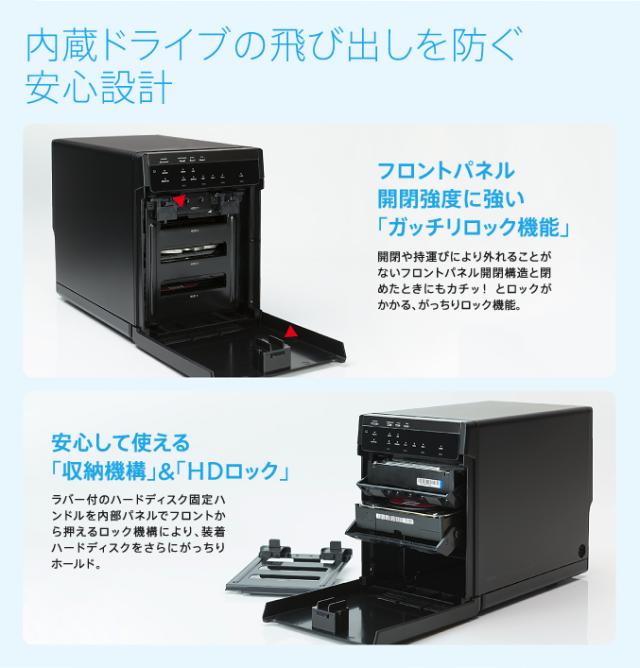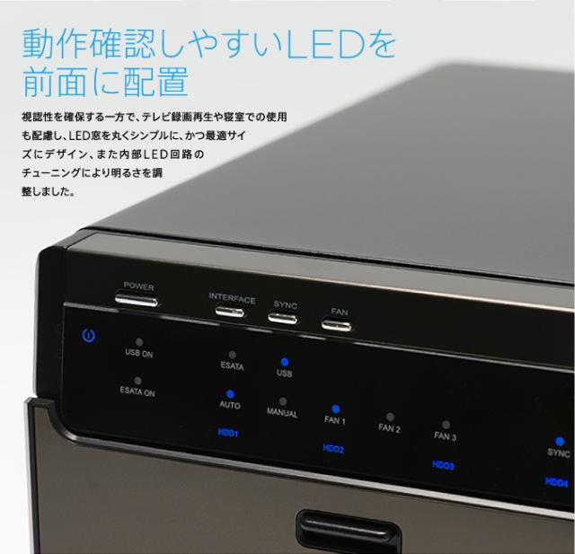 付属品:製品本体/1台 ACアダプタ/1個 電源ケーブル/1本 ハードディスク固定用ハンドル/4個 ハードディスク固定用ネジ/8本 USB3.0ケーブル(1m)/1本 eSATAケーブル(1m)/1本 ねじ固定用ドライバー/1本 ユーザーズマニュアル/1部 保証書/1枚